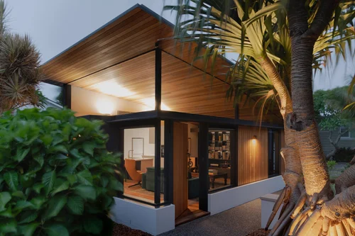The studio is divided into two pavilions which are connected by a visually simple flat roof and a highly permeable corridor formed from semi-transparent operable walls. The space between provides a framed view of the bush land behind the building. One pavilion is given over to living spaces and has a northern aspect for winter sun as well as connections to the covered patio space and yard. The other is more cloistered for privacy and is for bedrooms and bathrooms.